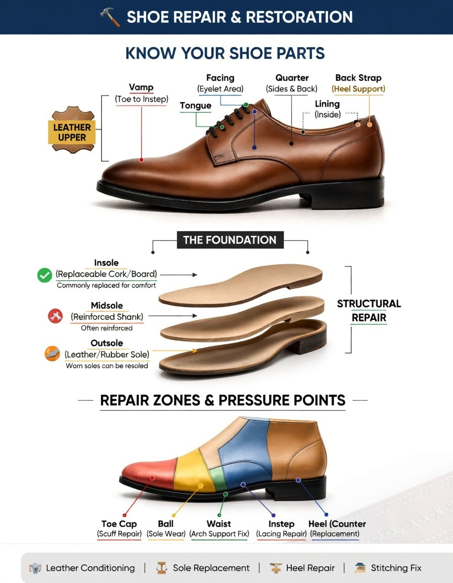We bring worn shoes back to life with precision and care. From resoling and stitching to zipper replacement and leather restoration, every repair restores both function and style. Our services suit boots, sneakers, and classic shoes alike, keeping your footwear looking great and lasting longer.